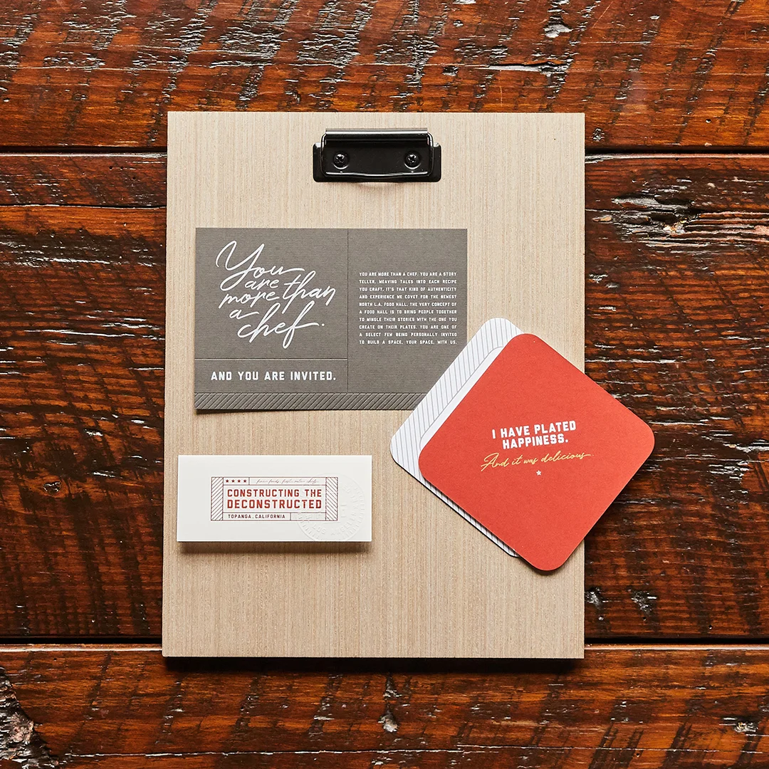 In lieu of a traditional leasing brochure, a loose-leaf delivery was driven by the idea of “Constructing the Deconstructed.” Playing on the popularity of deconstructed dishes, the à la carte clipboard design was equal parts practical and interesting. Local artists were also brought into the project to create a customized wood etching, original postcard art, and an illustrated map.